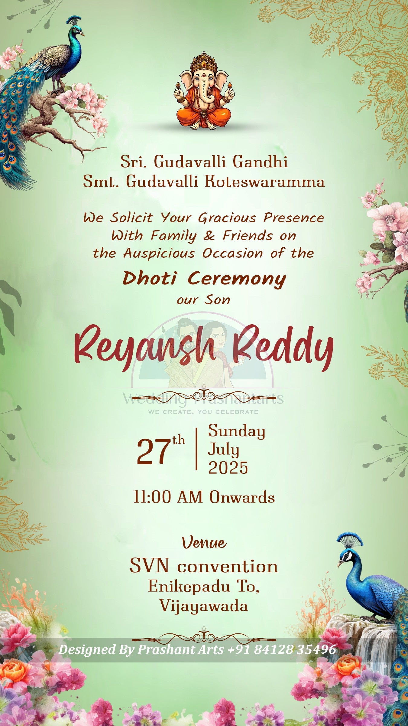 Make your son’s Dhoti Ceremony memorable with this elegant invitation. Featuring traditional colors and ethnic patterns, this static invite beautifully blends tradition with modern design.